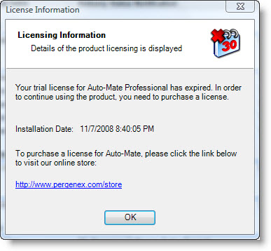 Auto-Mate operates full featured for a trial period of 30 days. After that period, you are reminded to activate your license to continue using the software. The following popup window will appear while using Auto-Mate: