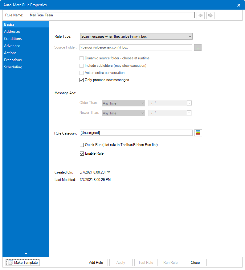 9.Execute Actions on a schedule - This rule does not scan folders for messages. It is used to execute actions on a schedule.